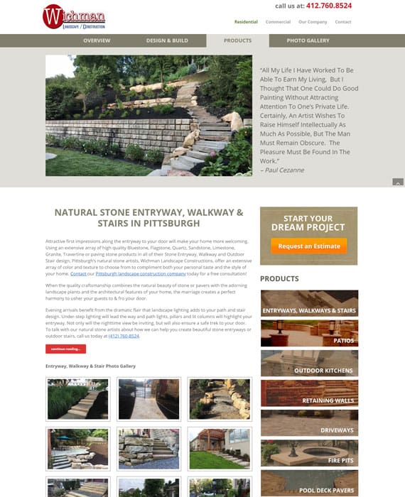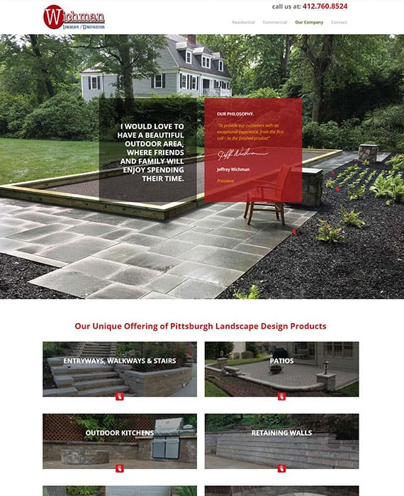 Wichman Landscape Construction offers a breath of products and services to the Residential and Commercial Landscape market located in and about the Greater Pittsburgh area. 01 WordPress Project Galleries 02 Web Design UX / UI DESIGN LOCAL SEO GOOGLE ADS